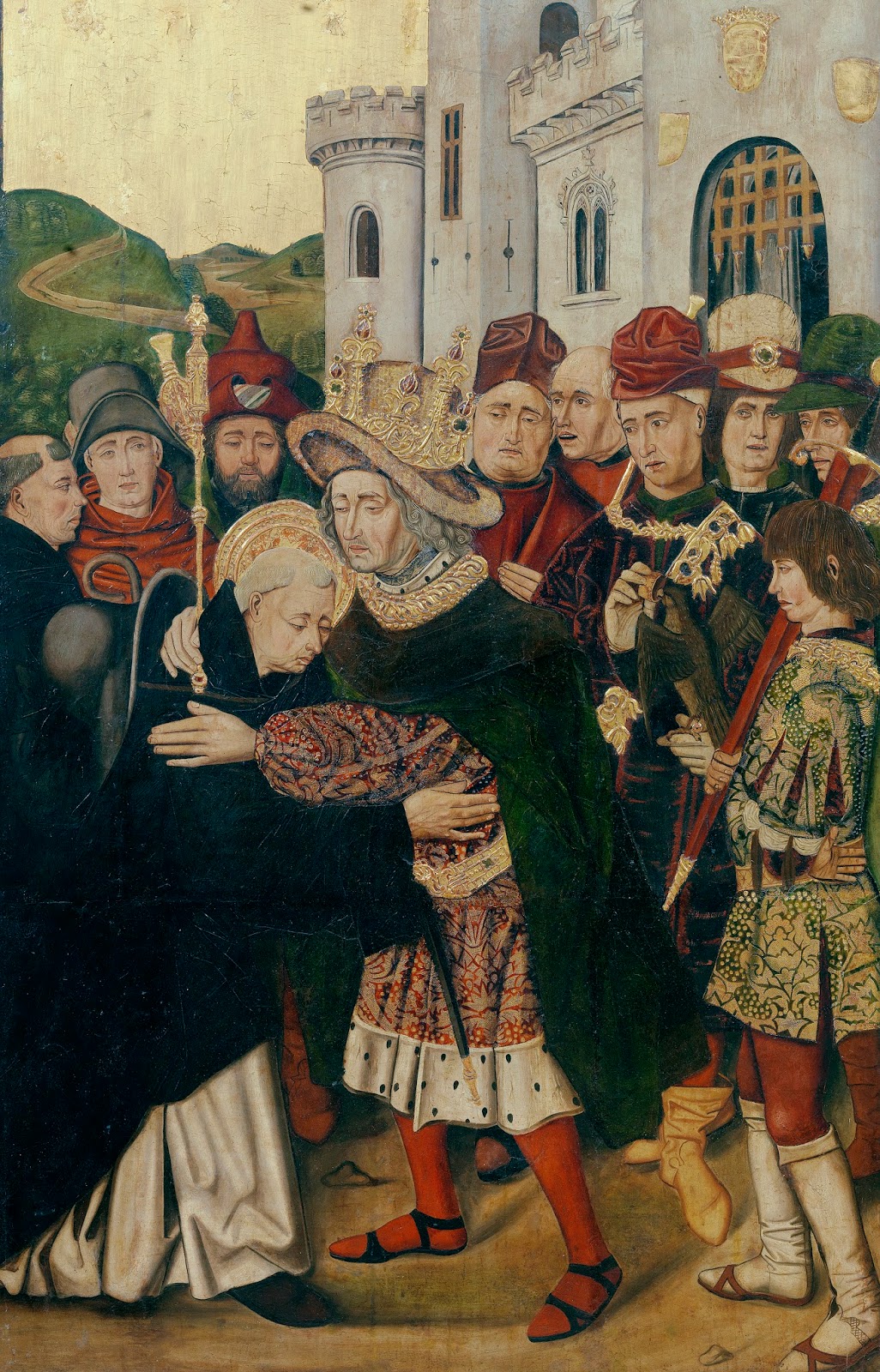 En honor del santo abad Domingo Manso, contemplamos hoy una tabla de Bermejo, que perteneció al retablo de la iglesia de Santo Domingo de Silos de Daroca (Zaragoza). El rey de Castilla Fernando I, acompañado de diversos magnates ricamente ataviados, recibe a las puertas de Burgos al santo, huido del monasterio riojano de San Millán de de la Cogolla, tras enfrentarse con el rey don García de Nájera. Santo Domingo pasa al decaído cenobio de San Sebastián de Silos, que por su celo monástico conocerá un gran florecimiento, cambiado su nombre para la posteridad por el de Santo Domingo de Silos.
