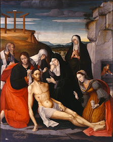 Todos estos días hemos venido contemplando la obra de Juan de Flandes, especialmente las tablas que pintó para el retablo mayor de la catedral palentina. Hoy seguimos con el Entierro del Señor. Nicodemos y José de Aritmatea proceden a depositar el cadáver de Jesús en una tumba, mientras María, enlutada, es consolada por Juan, y la Magdalena está a los pies del sepulcro con un frasco para los ungüentos. Las otras tres Marías también están a los pies del sepulcro, y en el centro hay un personaje que ha sido identificado como el propio Juan de Flandes. Un perro, símbolo de la fidelidad, huele en primer plano unas piedras preciosas de colores, símbolo de la grandeza del momento. Por detrás, un ángel contempla la escena; y todavía otro personaje, con un manto rojo, dirige su mirada hacia nosotros en primer plano. Al fondo, desde un óculo abierto en la pared, un búho nos invita a la vigilancia.